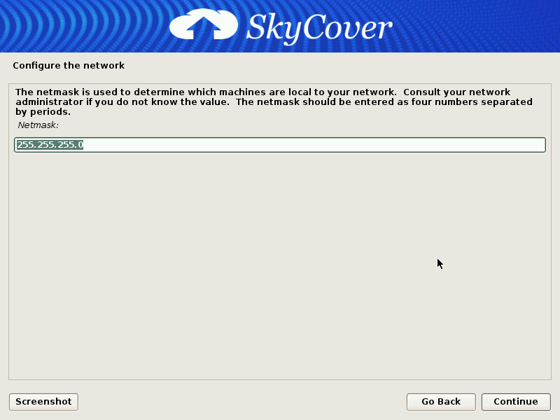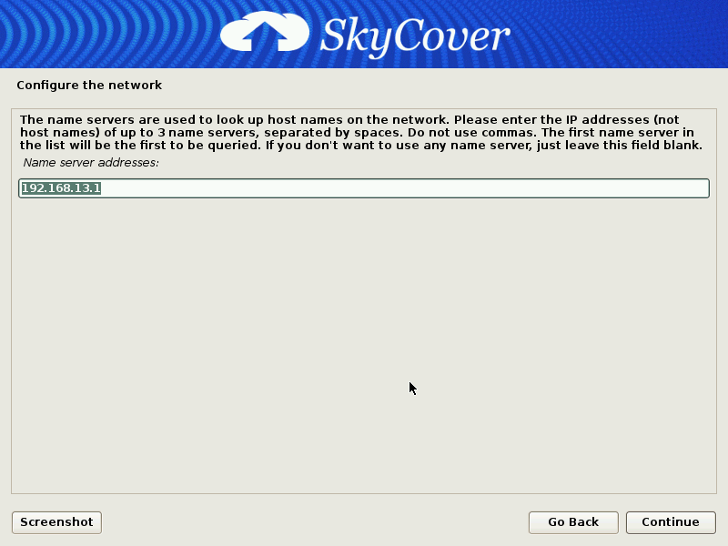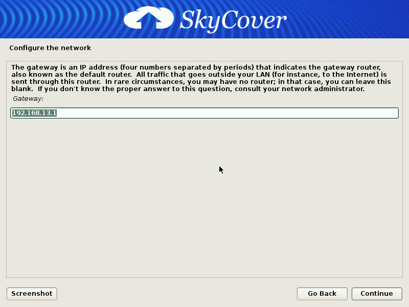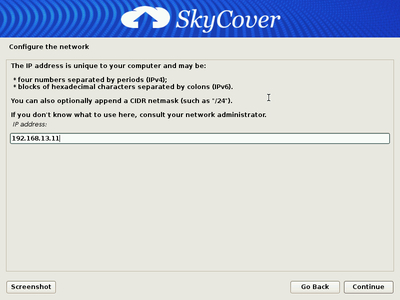 Указываем IP адрес узла (подходит любой свободный из вашей сети), в нашем случае это 192.168.13.11 и выбираем пункт <Continue>