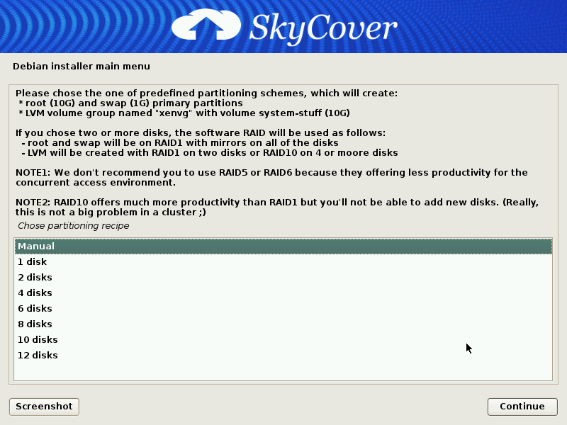 Если у Вас сервер с двумя типами дисков, например, 2 SATA и 8 SAS (с аппаратным RAID или без него), мы рекоменудем выполнить установку на 2 SATA диска с авторазметкой "*2 disks*".
