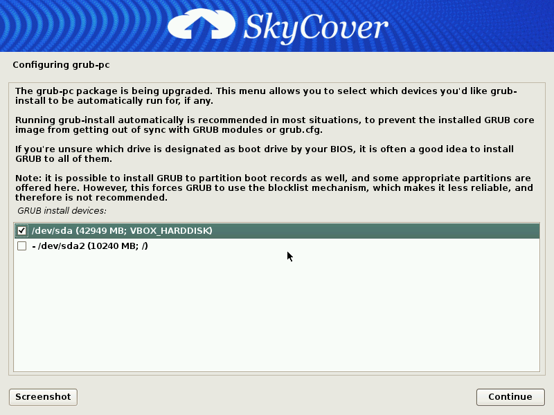 После установки пакетов системы необходимо указать диск для установки загрузчика grub.