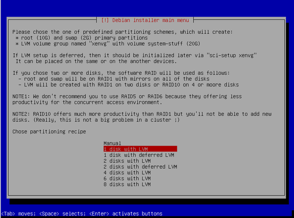 If you have a server with two types of disks, for example, 2 SATA drives and 8 SAS drives (bare or under hardware RAID), we suggesting to do a initial setup at whole on the SATA drives with "*2 disk with lvm*" template, and after initialization of a cluster, add SAS disks manually as additional LVM VG.