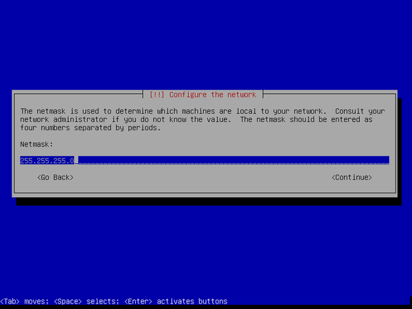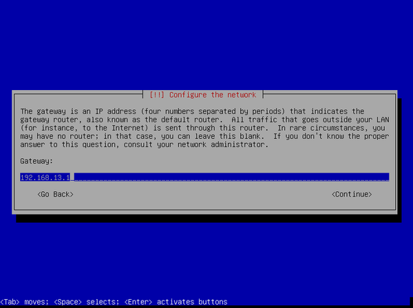 Specify a static IP address for the LAN connection (you can use any free ip from your LAN. In our case it is 192.168.13.11. Tap <Continue>